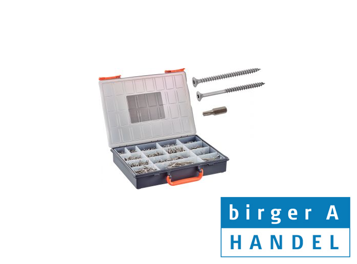 (inkl. moms)Art 9047 undersænket hoved spånpladeskrue sortiment rustfri syrefast A4 Ø3.0-5.0 15 rums sortiment